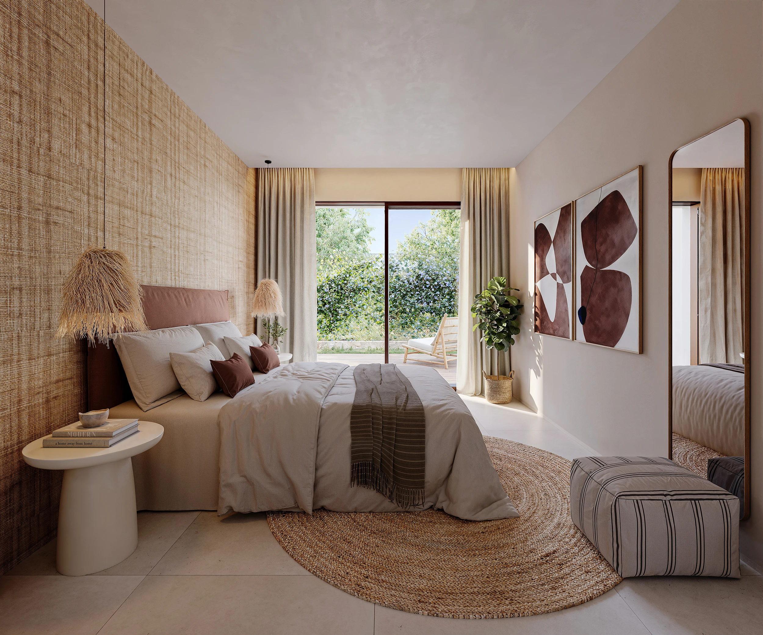 These exclusive homes with two bedrooms and two bathrooms, one of them en suite, open onto spacious terraces that extend outdoor living, connecting indoors and outdoors in a single Mediterranean experience. The communal swimming pool, the garden areas and the communal areas create a serene atmosphere ideal for enjoying the climate and the southern light all year round.